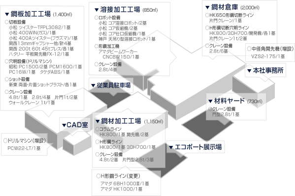 | 主な設備 | H形鋼穴明機/H形鋼バンドソー/H形自動開先機/ビームワーカー/角P切断、角P用開先機/コラム切断用バンドソー/ コラム自動開先機/コラム溶接加工ロボットシステム/プラズマ切断機/ガス溶断機/ギャップシャー/ブレーキプレス/ドリルマシン/鋼板用開先機 | |